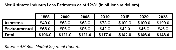 AM Best has not changed these estimates since its year-end 2020 report, despite the emergence of new environmental cleanup concerns like PFAS, microplastics, coal ash, and ethylene oxide, and the proliferation of asbestos-containing talc lawsuits. The report does contains a long discussion on PFAS litigation and coverage issues, so clearly, AM Best is monitoring the emerging losses closely. It will be interesting to see whether the ultimate environmental loss estimate is revised after AM Best analyzes the year-end 2024 filings.
